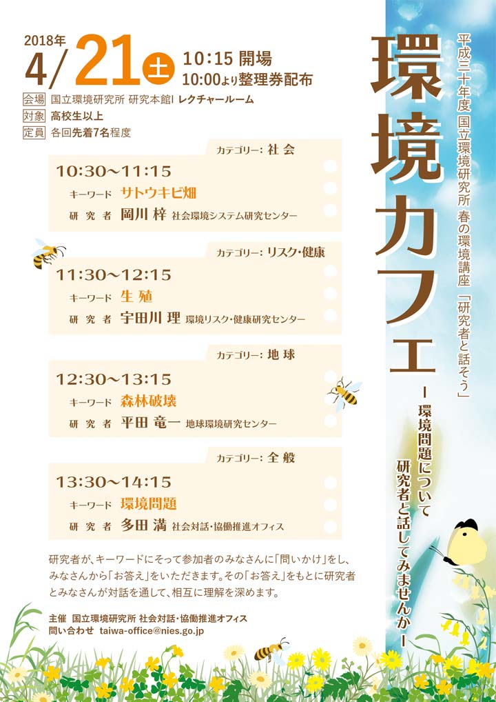 詳細は 国立環境研究所「春の環境講座」—講演および展示や体験イベントなどの詳細 をご覧下さい。